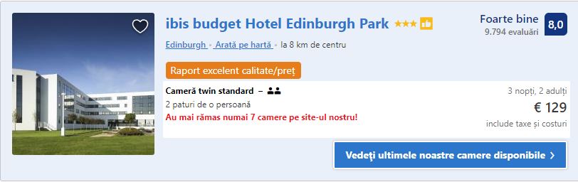 - Cazare 1: Ibis Budget Hotel Edinburgh Park – 129 euro / 3 nopti / camera dubla