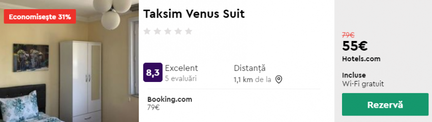 - Cazare 3: Taksim Venus Suit – 55 euro / 3 nopti / camera dubla