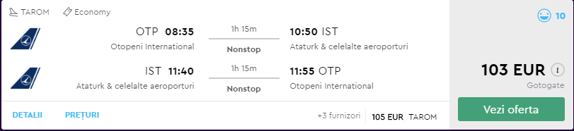 - Zbor: Bucuresti – Istanbul, 103 euro, dus-intors, TAROM, bagaj de cala inclus