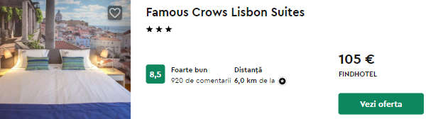 - Cazare (opt.1) Famous Crows Lisbon Suites – 105 euro / 3 nopti / camera dubla