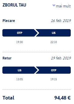 - Zbor: Bucuresti – Lisabona, 94.5 euro, dus-intors, operat de Blue Air