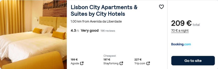 - Cazare (opt. 2): Lisbon City Apartments & Suites by City Hotels – 209€ / 3 nopti / camera dubla
