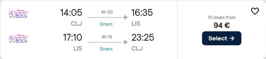 - Zbor: Cluj – Lisabona, 94€, dus-intors, operat de Wizz Air