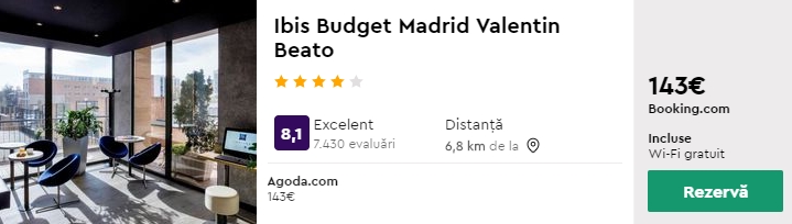- Cazare 1: Ibis Budget Madrid Valentin Beato – 143 euro / 3 nopti / camera dubla