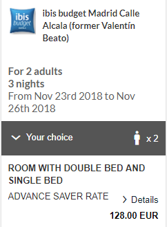 - Cazare 1: Ibis Budget Madrid – 128 euro / 3 nopti / camera dubla / taxe incluse