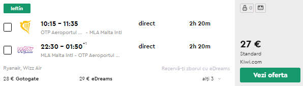 - Zbor Bucuresti – Malta, 27 euro, dus-intors, operat de Ryanair si Wizz Air