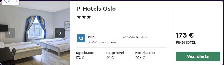 - Cazare 1: P-Hotels Oslo – 173 euro / 3 nopti / camera dubla