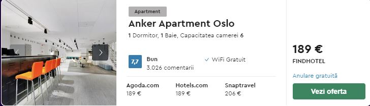 - Cazare 2: Anker Apartment Oslo – 189 euro / 3 nopti / camera dubla