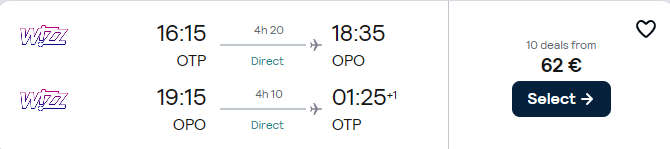 - Zbor: Bucuresti – Porto, 62€, dus-intors, operat de Wizz Air