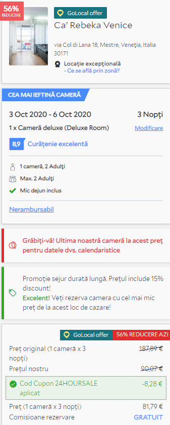 - Cazare 2: Ca’ Rebeka Venice – 82 euro / 3 nopti / camera dubla / mic dejun inclus