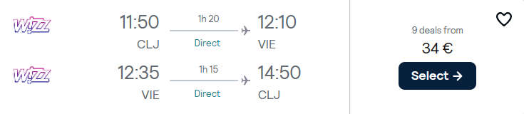 - Zbor: Cluj – Viena, 34 euro, dus-intors, operat de Wizz Air