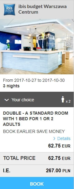 - Ibis Budget Warszawa Centrum – 63 euro / 3 nopti / camera dubla SAU