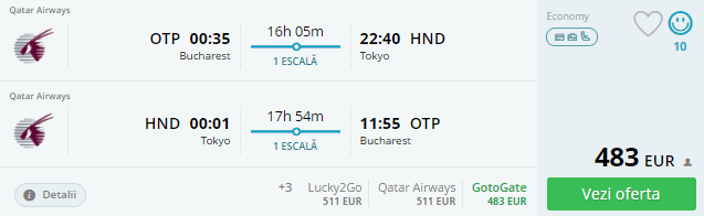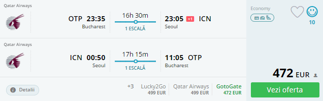 Am strans pentru tine o tona de zboruri catre Seoul si Tokyo, inclusiv in perioada Festivalului Ciresilor! Qatar Airways este companie de 5* Skytrax, iar bagajul de cala este inclus. Ultima promotie Qatar Airways ti-am prezentat-o aici.