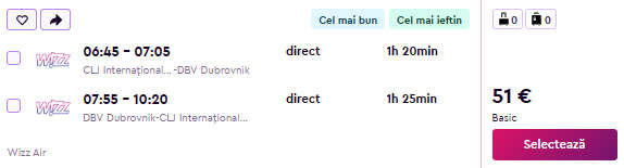 - Exemplu 1: Cluj – Dubrovnik, 51€, dus-intors, operat de Wizz Air