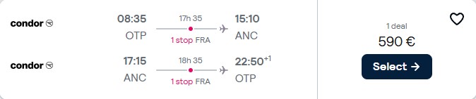 - Zbor: Bucuresti – Anchorage, 590 euro, dus-intors, operat de Condor