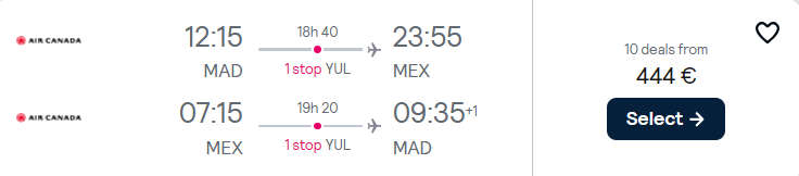O serie de zboruri foarte ieftine catre Mexico City cu plecare din Madrid. Zborurile sunt operate de multiple companii aeriene, iar preturile incep de la 444 euro, dus-intors.