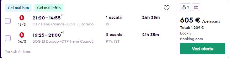 - Zbor: Bucuresti – Bogota, 605 euro, dus-intors, operat de Turkish Airlines