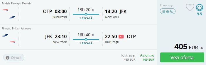 - Bucuresti – New York, 405 euro, dus-intors, operat de British Airways, Finnair