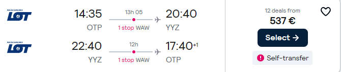 - Exemplu: Bucuresti – Toronto, 537€, dus-intors, operat de LOT